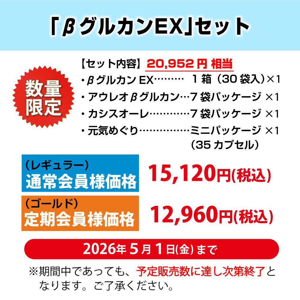 アウレオで人気No.1の「βグルカンEX」が入ったお得なセットです。